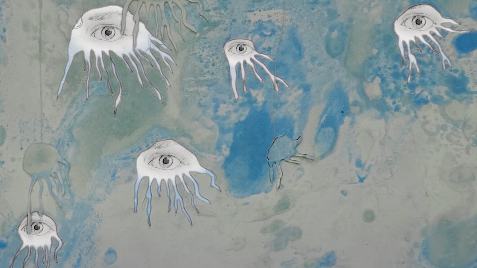 The video “Transparent like the concrete sea” is about being fluid, travelling the world as a story, narratives and the network they exist in. It starts with the story of cargo ships, carrying commodities and hitchhikers like the peach blossom jellyfish, an organism that starts as a tiny polyp. We never see it, until the climate change makes the temperature rise. Then it surprises us: jellyfish (also called medusas) in our sweet water, in our ponds, our canals, our lakes. So, there she is, Medusa, able to freeze our world.